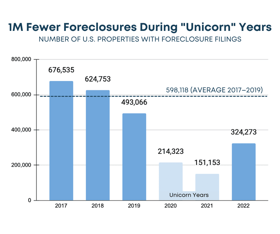 Although there has been a recent increase in foreclosure filings coming out of the unicorn years, it's important to understand that they remain relatively low compared to historical levels! Today, the number of foreclosure filings is 46% lower than the average between 2017–2019.