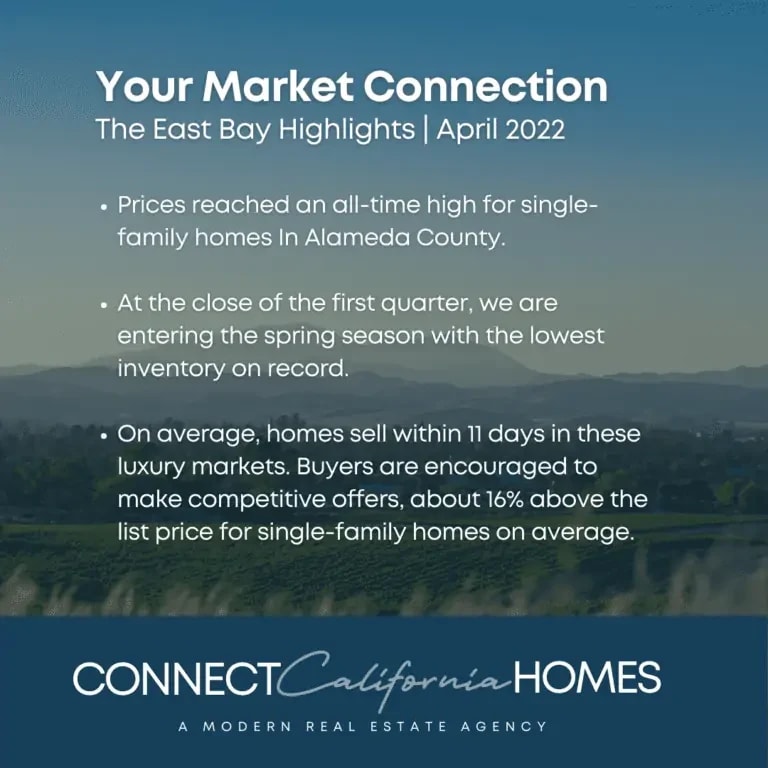 As we dive deeper into the spring season, we’re sharing our East Bay market updates and highlights for April. At Connect California Homes, our team of service-focused agents is steadfast in our commitment to advocate for our buyers and sellers as we help them navigate this housing market.